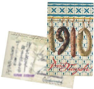 ぶらさがったソーセージが1910年の年号を表しています。イギリスのノッチンゲンから、オーストリアのウィーンへ日本人同士が交換した年賀状です。