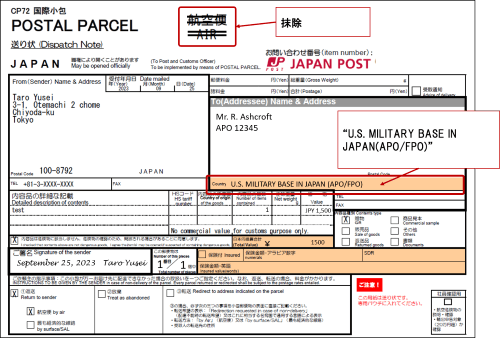填写收件人信息以及APO/FPO+5位数或者9位数的号码。如果是小包邮件,请在国际邮件我的页面服务中,在国名栏选择“U.S. MILITARY BASE IN JAPAN(APO/FPO)”,制作小包邮寄单。打印在邮寄单上的寄送方法(航空邮件、SAL邮件、海运邮件)会被抹除,使其无法被看见。