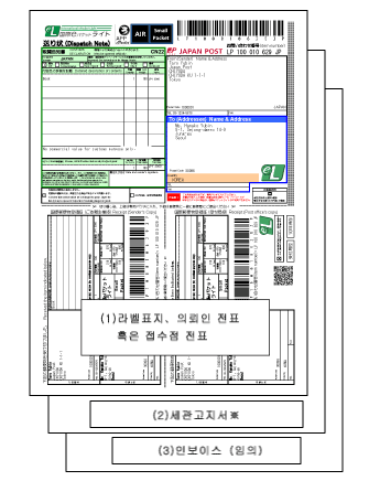 (1) 라벨표지、의뢰주용 전표 혹은 접수점용 전표 (2) 세관 고지서※ (3)인 보이스(임의)