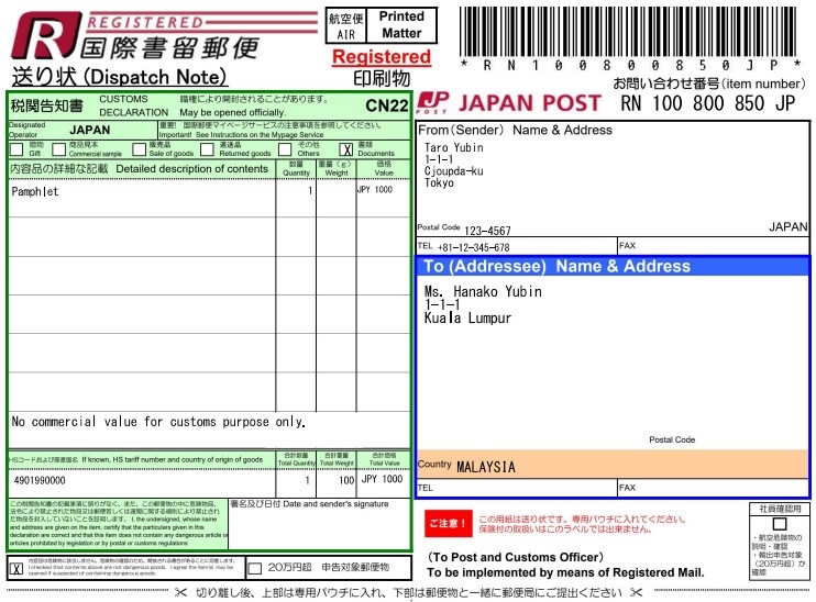 ※不使用标签时,请在邮件的表面写上Registered(英语)或者Recommandé(法语)。