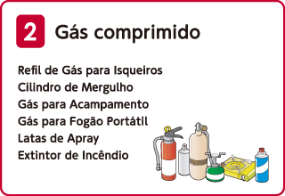 | Gás comprimido:Extintor de incêndio, Cilindro para mergulho removedor de sujeiras (tipo spray), oxigênio condensado portátil, gás hélio, gás para aquecedores de acampamento, gás para fogão portátil, gás para isqueiros | ||