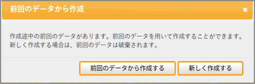 入力したデータが保存されている場合、ログイン後にメッセージが表示され、前回のデータを使用して作成を再開するか、新しく作成するかを選択できます。
