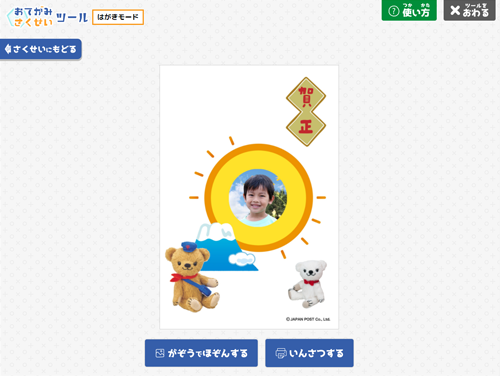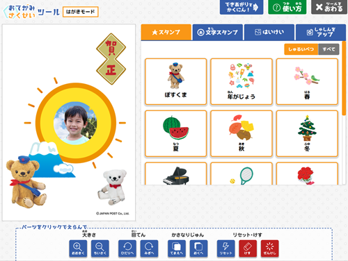 作成いただいた作品は画像として保存したり、ご自宅のプリンターで印刷して実際にご使用いただけます。 - 年賀状や季節のお便りのスタンプを豊富にご用意しておりますので、ぜひお手紙作りにお役立てください。