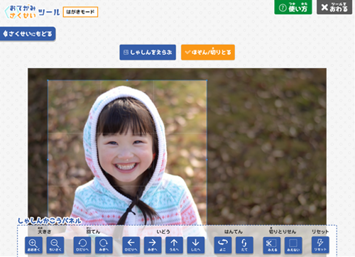 - 当ツールは、はがき、びんせん(A4サイズ)のスペース内に、スタンプや文字スタンプ、写真などを配置して、オリジナルのお手紙を作成するものです。