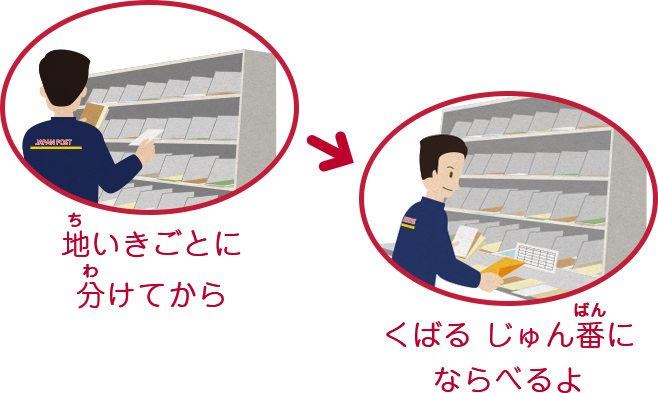分けられたお手紙は、あて先ごとに郵便局へ運んでいくよ