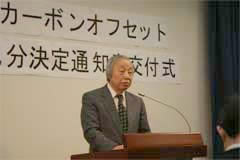 交付式の冒頭、弊社代表取締役会長CEOの北村より「寄附金の配分を受けられます皆様方には、寄附を寄せられました方々の期待に応えるべく、是非とも素晴らしい事業成果を出され、地球温暖化防止に大きく貢献していただきたいと願っています。」とご挨拶申し上げ、通知書の交付に移りました。その後、配分団体の皆さまに、それぞれの配分事業であるCDM排出権取得・償却事業助成プログラムについて、プレゼンテーションを行っていただきました。