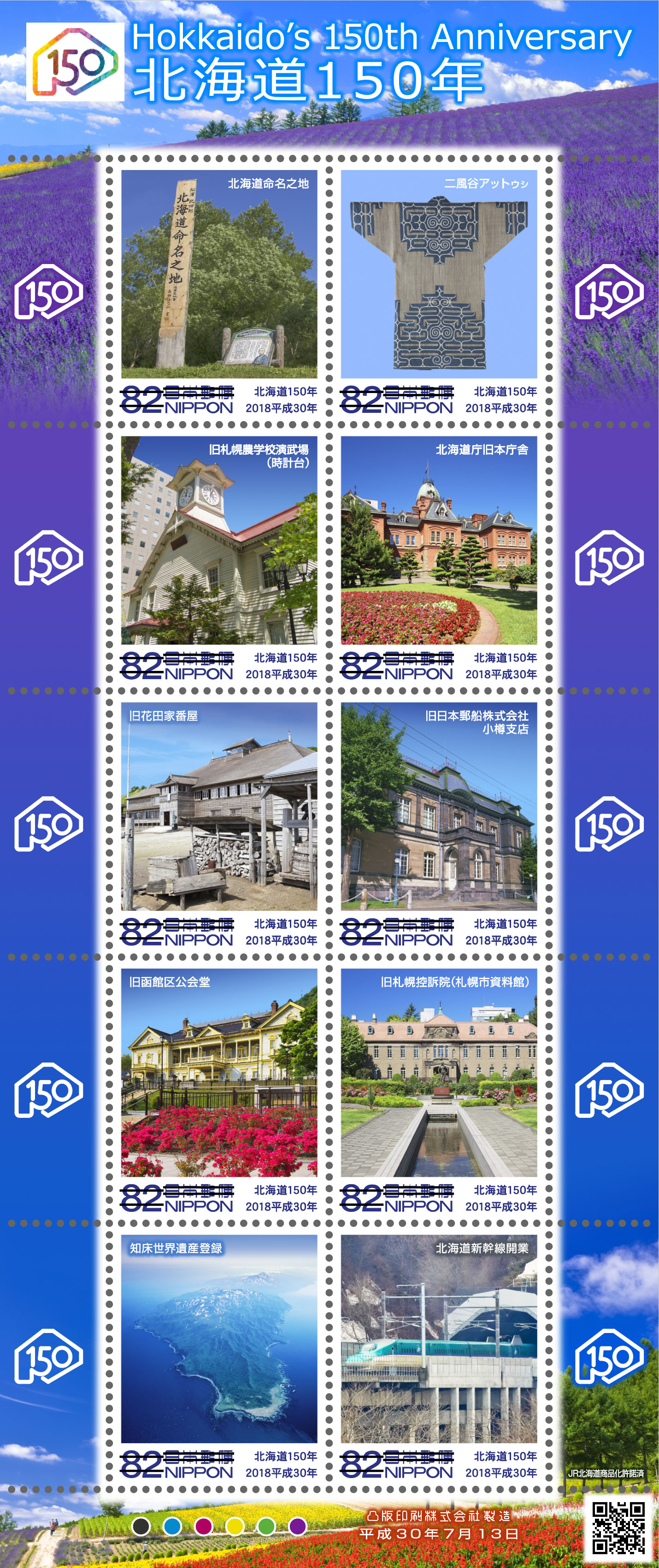 「北海道」と命名されてから、2018(平成30)年で150年目の節目を迎えたことを記念した切手です。