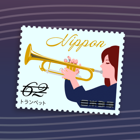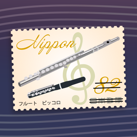 演奏中、フルートとピッコロを持ち替える奏者がいることから、同じ切手の中に描いています。