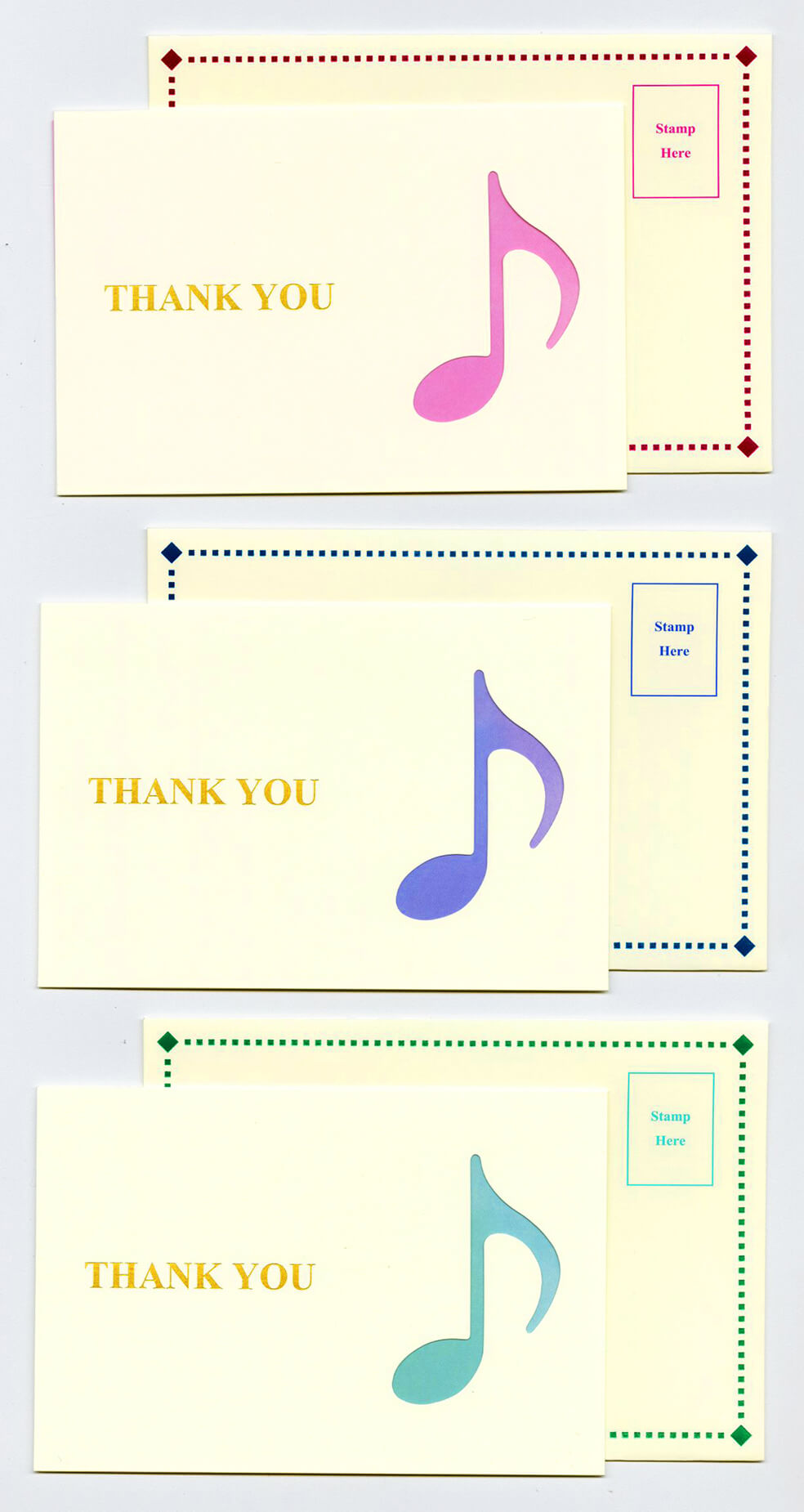 - 「音楽でありがとうを伝える切手」とセットでお使いいただけるよう、ピンク・青・緑の3色のメッセージカードと封筒を用意しました。