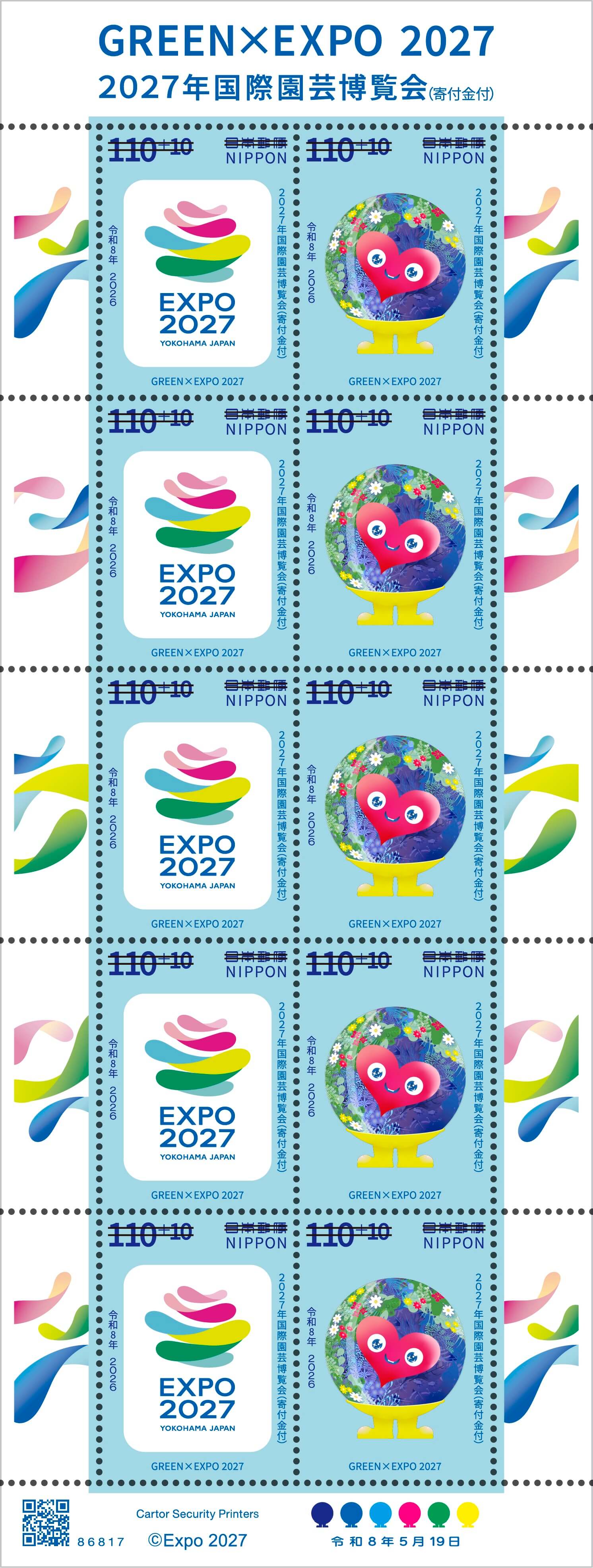 - この切手は、1枚につき10円が寄付金となり、2027年に開催される2027年国際園芸博覧会の準備および運営に役立てられます。