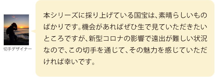 企画立ち上げの際、どんなシリーズにしていくか検討し、数ある国宝の中から、様々な日本の文化を統一感を持って紹介できるよう国宝の種類ごとに採り上げることとしました。