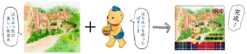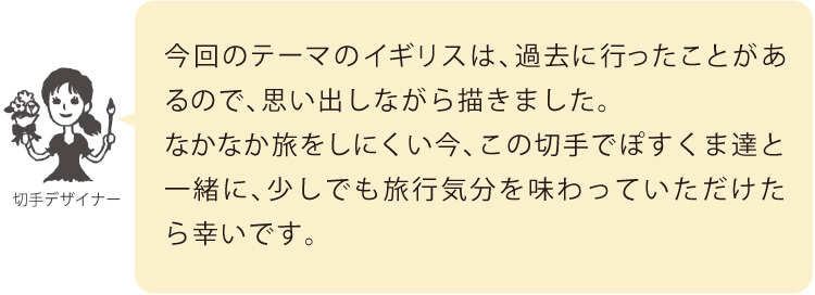 切手に使用したイギリスの観光地・名所は、英国政府観光庁と相談しながら、通りやバス等のイメージを選定しました。旅する絵本のような仕上がりを目指して、選定した観光地・名所とぽすくまを水彩で別々に描き起こし、パソコン上で合成しています。
