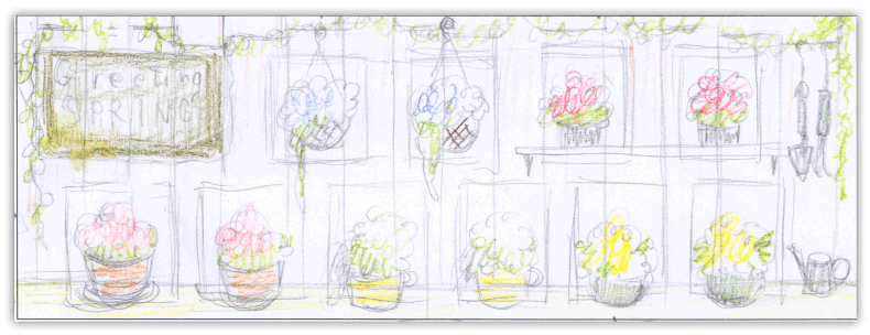 ▲ アイデアスケッチ。色とりどりの寄せ植えを並べたイメージ。