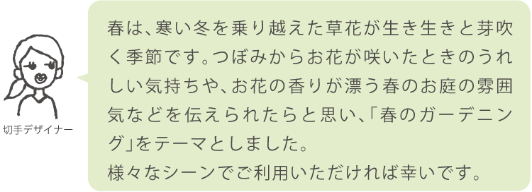 これまでの「春のグリーティング」では、桜を採り上げること多かったのですが、桜は開花期間が短いので、長くご利用いただけるよう、春から初夏まで咲く花を調べました。