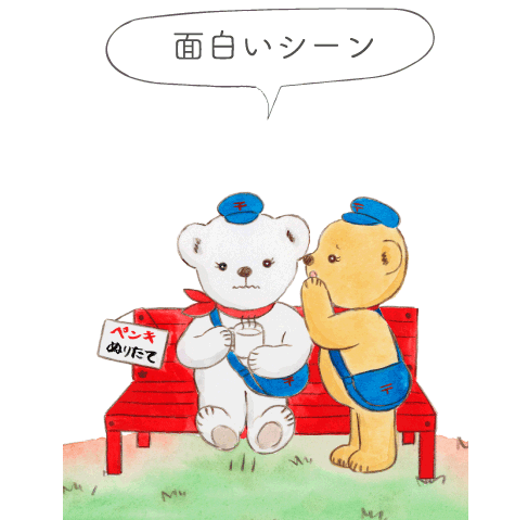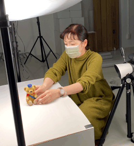 まず、ぽすくまのぬいぐるみをアニメのように少しずつ動かしながら一枚一枚撮影します。そして、その大量の写真素材から選定し、パソコンに取り込み、さらに、表情がわかりやすいよう、まつ毛や口角等を微妙な加減で調整しています。