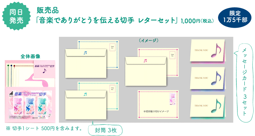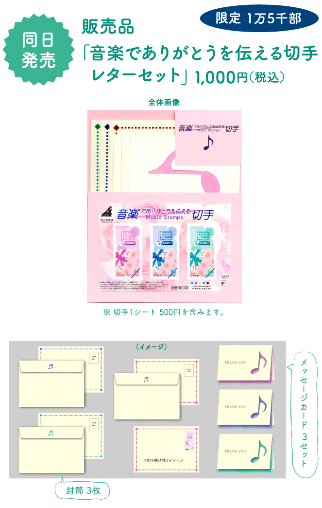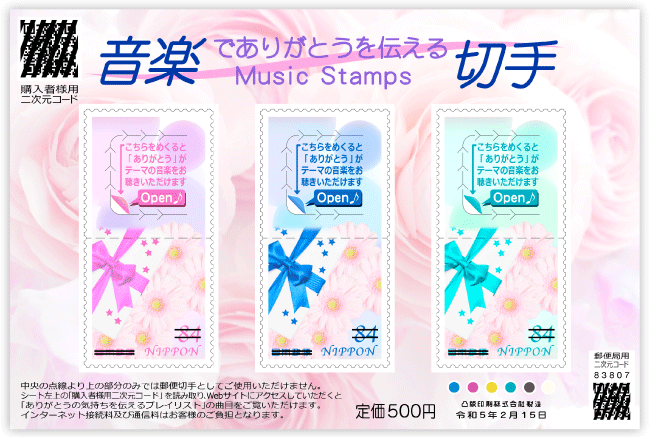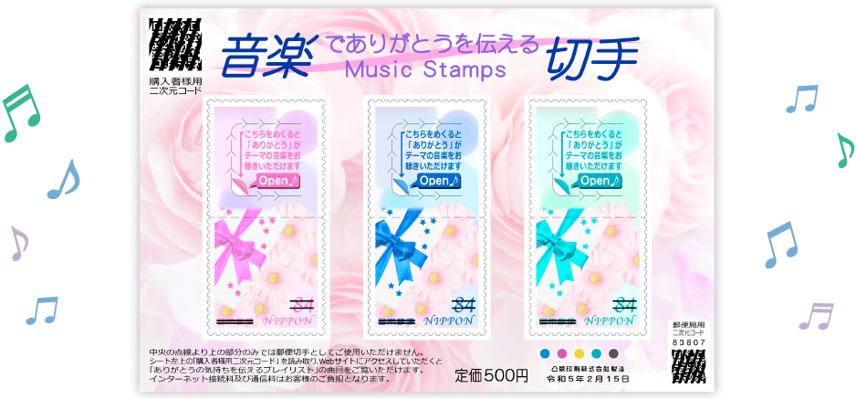 さまざまな感謝の思いを伝えるお手紙にご利用いただける、今までにない音楽を提供できる機能を持つ切手です。