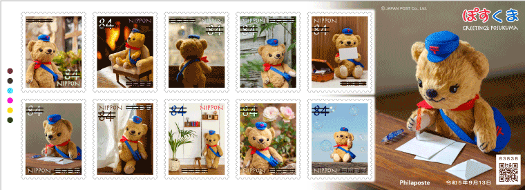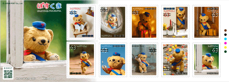 「ぽすくま」は、2012年にぬいぐるみのキャラクターとして誕生し、切手には同年の「秋のグリーティング」から登場しています。