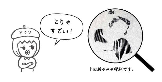 印刷は、凹版というお札にも使われている特殊な技術を使っています。金属版に細くて細かい線や点を彫って、そこにインクを詰めて紙に転写するというもの。ぜひ、ルーペで覗いてください。