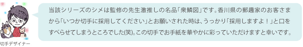 香川県の県魚であるハマチ案と正月を想起するエビ案の2案を作成しましたが、『背景の松葉文様が海の波に見えるので、エビよりも波間を行くハマチの方がマッチしている』との意見があり、ハマチが採用されました。