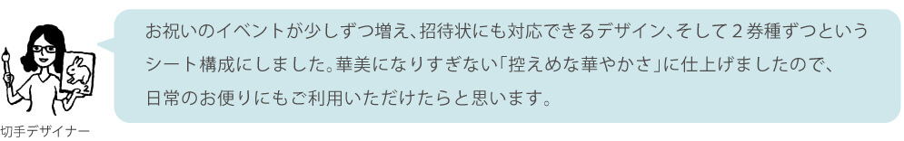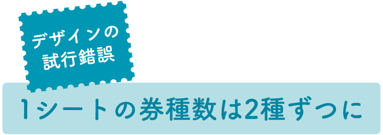 また、1シートあたりの券種数は、5券種の案も作成して検討しましたが、案内状等で大量にご利用される際にどれを貼るか悩まなくてもよいよう2券種に絞りました。