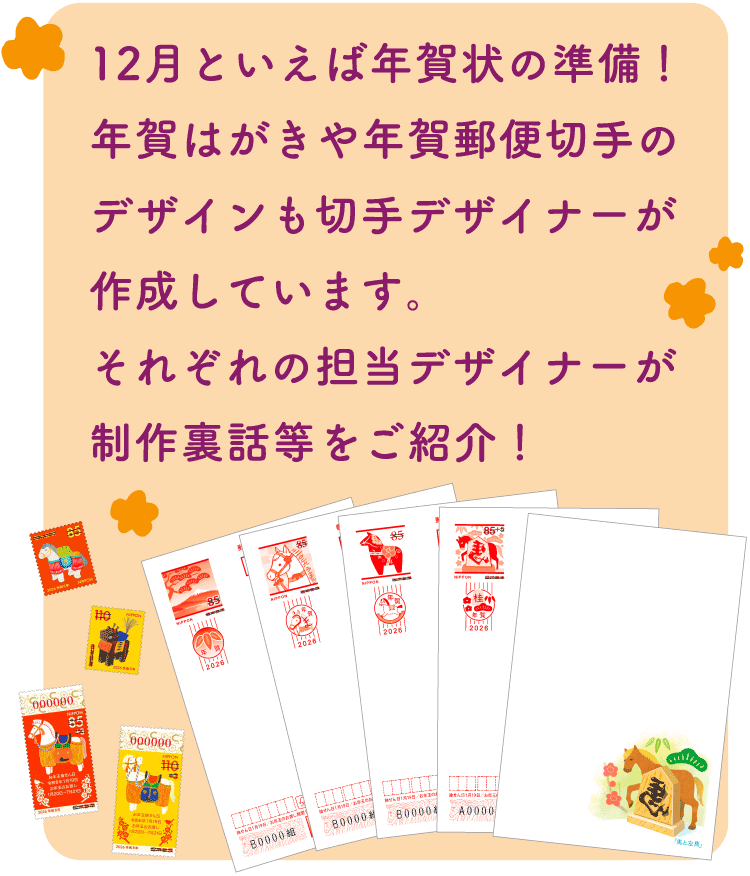 例えば、料額印面部分の馬のたてがみをよく見てみると、「二〇二六うま」という文字が隠れています。デザイン作成時は、何案も下描きしながらアイデアを出していきます。