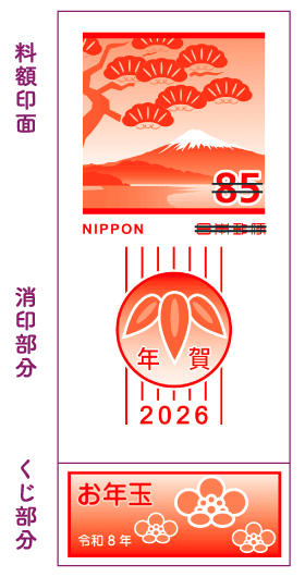 料額印面は富士山に「松」、消印部分に「竹」、くじ部分に「梅」のイメージを描き、全体で「松竹梅」を表現しました。