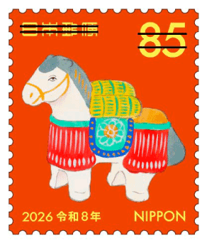 今回のテーマは、年賀郵便切手(寄付金、お年玉くじなし)は「川崎巨泉のおもちゃ絵」。寄付金付お年玉付年賀郵便切手は「飾り馬」。