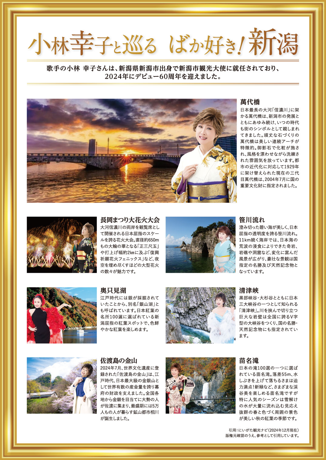 新潟県新潟市出身で新潟市観光大使に就任されている歌手の小林 幸子さんが、新潟県の四季折々の名所巡りをしているようなデザインのフレーム切手を作成しました。付属品としてB5解説紙とA4クリアファイルがセットになっており、煌びやかな衣装をまとった小林 幸子さんと新潟県の美しい風景を楽しんでいただける商品となっています。