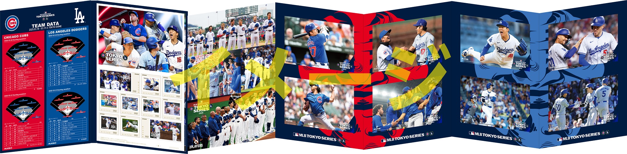 3月18日、19日に東京ドームで行われるロサンゼルス・ドジャースとシカゴ・カブス戦の試合写真を使用したフレーム切手をセットにした商品です。