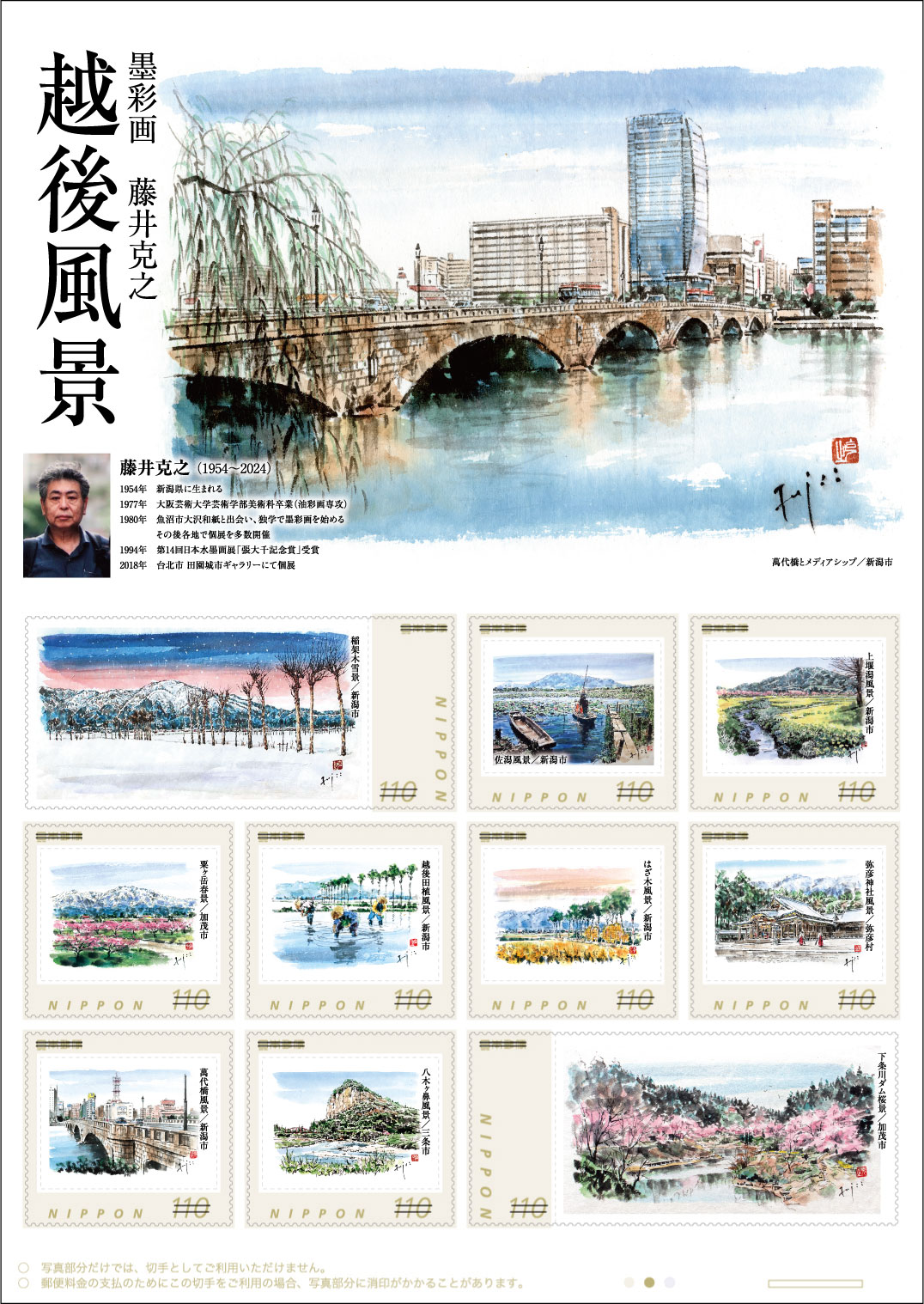 新潟県出身の墨彩画家 藤井 克之さんが描いた新潟県の風景作品をオリジナル フレーム切手にしました。