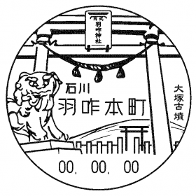 - 羽咋神社鳥居、同神社狛犬、大塚古墳を配す。