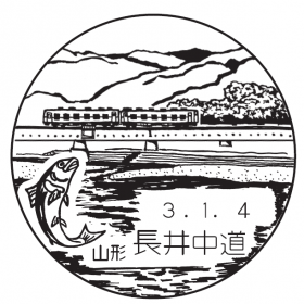 - 西山から流れる置賜野川に架かる桟橋の上を汽車(フラワー長井線)が進み、清流で鮎が踊る姿を描く