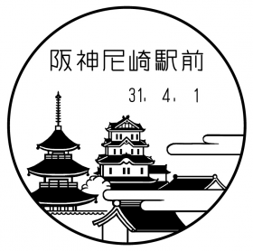 - 阪神尼崎駅前郵便局の東側約400mに所在する尼崎城と、南隣に所在する本興寺の三重塔を描く。