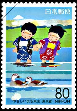 デザイン 男の子と女の子が水遊びをする前を、つがいのカモが寄り添うように泳いでいく情景を描いています。 やさしい思いやりやほのぼのとした助け合いの大切さを富士山を望む懐かしい風景から暖かく伝えており、人の温かさ、ぬくもりにあふれた東京の姿を想像して描いています。 意匠には、水辺にて男の子が女の子の手を取り、水遊びをする前をつがいのカモが寄り添うようにして泳いでいく情景を描いており、助け合いとふれあいを表しています。 |