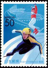 | ●「第5回アジア冬季競技大会」について アジア競技大会は、アジアの若人の友情及び親善の促進を目的としたスポーツの祭典であり、冬季競技大会は、昭和61(1986)年に第1回大会が開催されました。 第5回となる今大会は、「Asian Beat とどけ世界にアジアの響き」をスローガンに、平成15(2003)年2月1日(土)から同月8日(土)まで、青森県の6市町の会場において開催されます。 ●デザインについて 前面にショートトラックスピードスケート男子の選手及び今大会で初めて公式競技種目となったフリースタイルスキーの女子モーグルの選手を、背後に今大会の開閉会式会場である青い森アリーナのイメージを描いています。 |