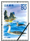 広島県:広島県の鳥「アビ」とアビ渡来群遊海面の風景を描いています。 |