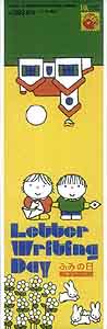 また、“オムニバス”風のシートデザインで発行する「ふみの日」切手は今年が3回目となりますが、平成11年発行のものの背景模様は「LETTER」の文字、平成12年発行のものの背景模様は「WRITING」の文字になっており、今回発行のものと順に並べますと「LETTER WRITING DAY23」“ふみの日23”と読むことができることになります。