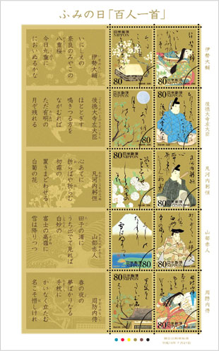 - 八十円切手シートは、十枚十種類のデザインで一シートの構成。切手は取り札と読み札が対になっています。またシートの余白部分には、現代語で歌を載せています。