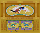 この高御座は、浜床という方型の基壇とその壇上に据えられる八角宮殿型の二部からなり、数々の装飾が施されています。浜床には、鳳凰の図と姿態と色調がそれぞれ異なる複数の麒麟の図が描かれています。このうち、浜床の正面中央に描かれた鳳凰((1)の切手および小型切手シート背景上部)、正面左側に描かれた麒麟((2)の切手)、正面右側に描かれた麒麟((3)の切手)を切手デザインとしています。