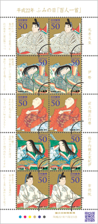 80円切手シートは、5つの歌をそれぞれ読み札と取り札に分けたデザインです。読み札には歌人が、取り札には歌をイメージした風物が描かれています。歌の文字は、現代の著名書家5名が新たに書いたものです。50円切手シートは、歌人(80円切手シートの読み札と同絵柄)を基にデザインしています。また、両シートともに、余白部分には現代仮名による歌と歌人の名前を記しています。