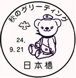 | 押印機 | 【日本橋支店名によるもの】 〒100-8799 東京都中央区銀座8-20-26 郵便事業株式会社 銀座支店気付 日本橋支店 「秋グリ・押印機(日本橋支店)」郵頼担当係 |