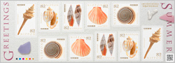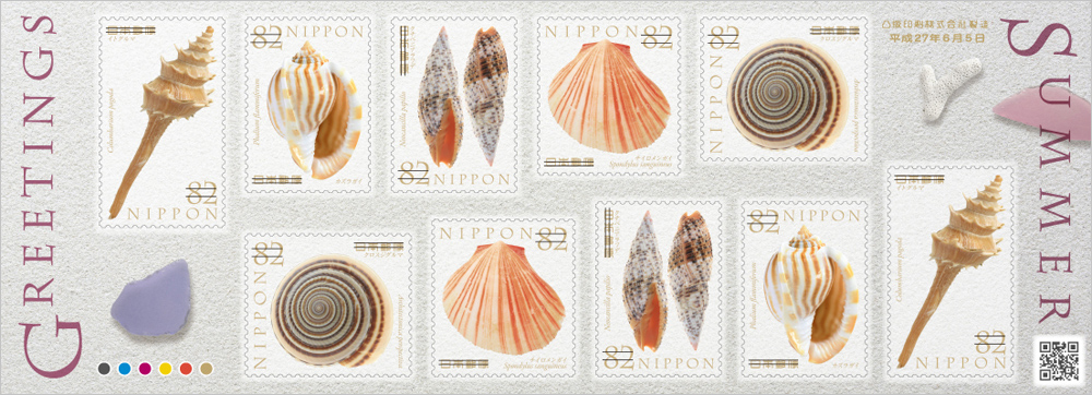 日本各地の海や砂浜で見られる様々な形の貝を切手のデザインとして採用しました。また切手シート背景には砂浜をイメージしたデザインを配置し、夏らしいデザインとしました。