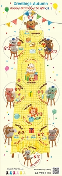 52円シート、82円シートともに「ぽすくまの誕生日」をテーマにデザインしています。52円シートでは、ぽすくまの仲間たちがプレゼントを持って、ぽすくまの家に行くシーンが描かれています。森の小鳥やハチたちもお祝いします。82円シートでは、ぽすくまのバースデーパーティーのシーンを描いています。