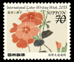 本年は70円郵便切手のデザインに広重の錦絵「藤袴(ふじばかま)に撫子(なでしこ)」(平木浮世絵美術館蔵)を採用しました。風景画家として有名な広重ですが、花鳥画にも優れた作品をたくさん残しています。