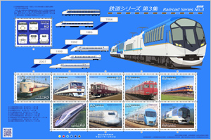 日本郵便株式会社(東京都千代田区、代表取締役社長 髙橋 亨)は、日本の鉄道車両等を題材としたシリーズの第3弾として、特殊切手「鉄道シリーズ 第3集」を発行します。第3集では、第1集および第2集と同じ趣向でデザインした「通常版」のほか、正面からみた鉄道車両をイラストでデザインした「イラスト版」の2種類の切手シートを発行します。