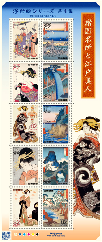 日本郵便株式会社(東京都千代田区、代表取締役社長 髙橋 亨)は、「諸国名所と江戸美人」として、歌川広重(うたがわひろしげ)筆「六十余州名所図会(ろくじゅうよしゅうめいしょずえ)」と江戸時代の浮世絵版画の美人画を題材とした、特殊切手「浮世絵シリーズ」を2012(平成24)年から発行しており、今回で4回目となります。