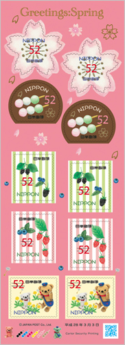 郵便局のキャラクター「ぽすくまと仲間たち」や桜や桃の花、ベリーなどを題材とした春を感じさせる素敵なイラストがそろった切手シートです。