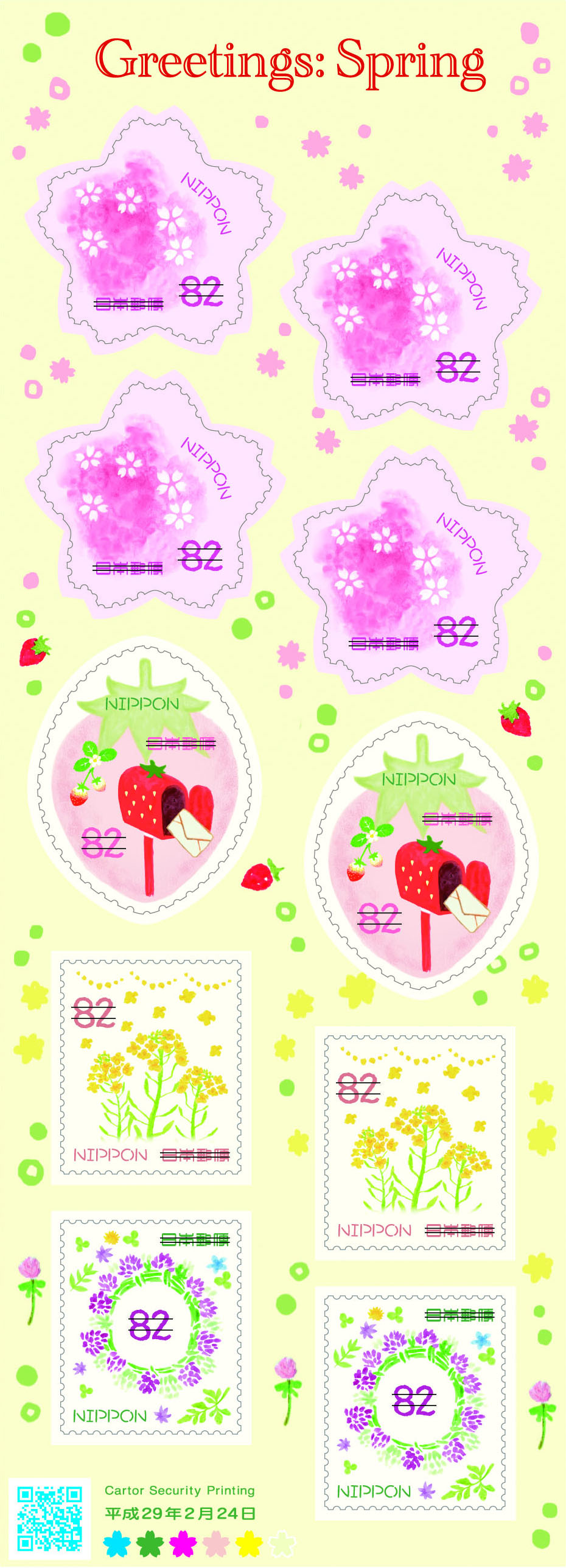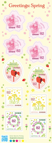 52円シート、82円シートともに、春の植物等をテーマとし、花やいちごの形にデザインした切手も含んでいます。