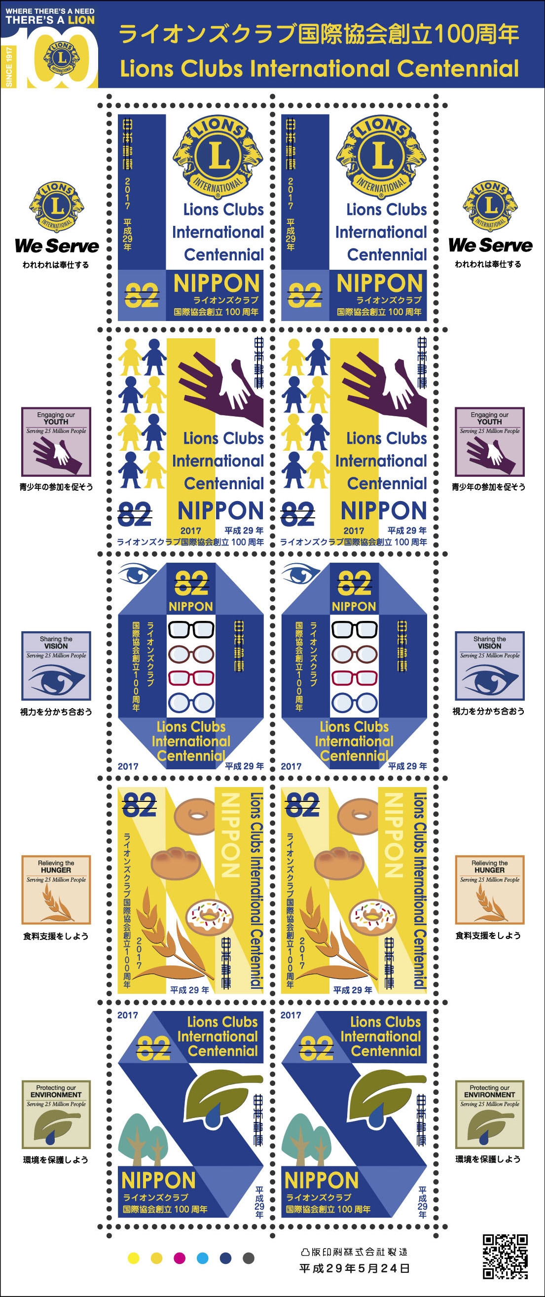 ライオンズクラブのロゴマークとライオンズクラブ国際協会創設100周年を記念して実施している「100周年記念奉仕チャレンジ」の4つの活動をイメージし、切手のデザインとしています。