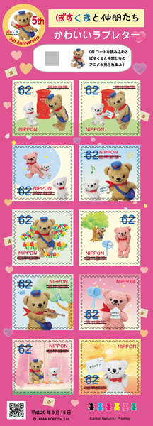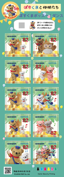 グリーティング切手「秋のグリーティング」(発行日は2012(平成24)年9月21日)から誕生したキャラクターである「ぽすくま」とその仲間たちをデザインしています。ぽすくまが初めて切手に登場してから今年で5年となるので、シート余白には、5周年を表すマークも入れています。